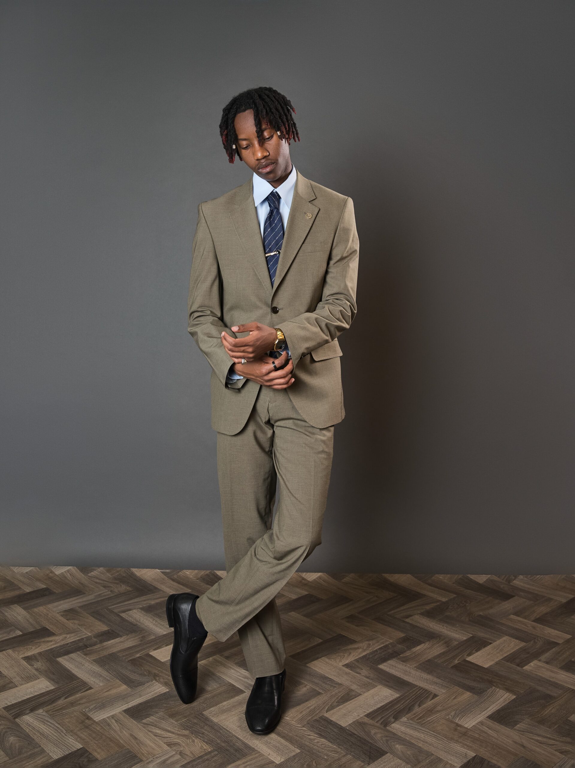 A sharp olive green suit tailored in a slim fit with a classic notch lapel — perfect for weddings, graduations, and special occasions.
