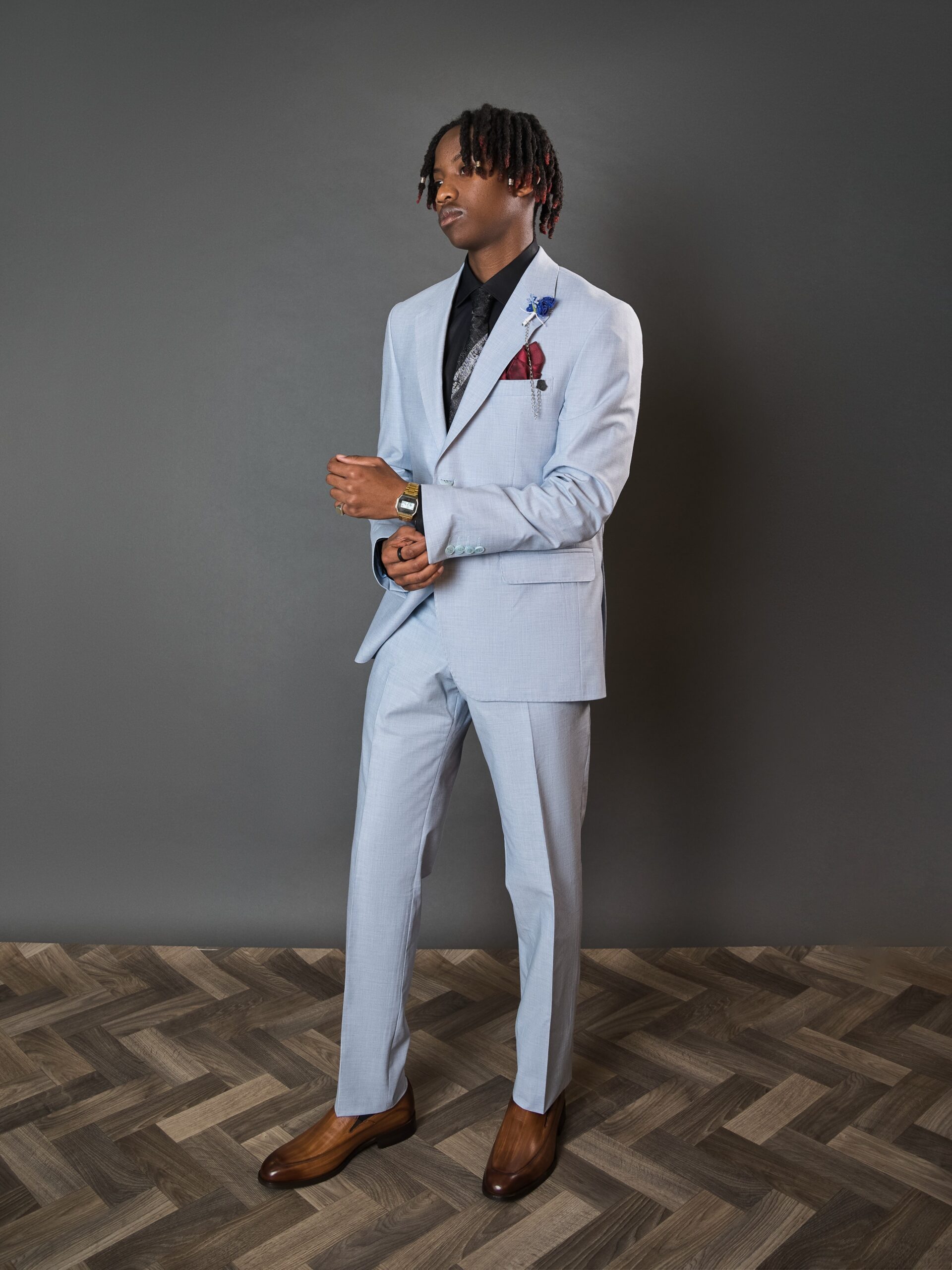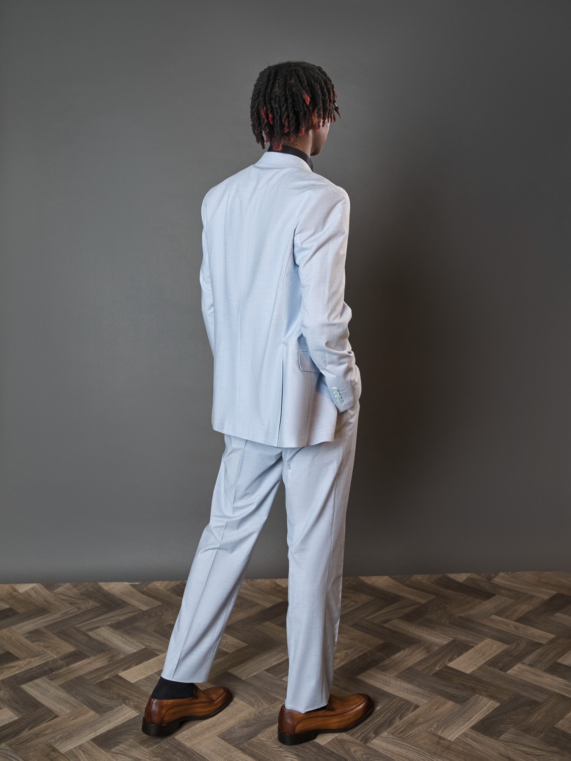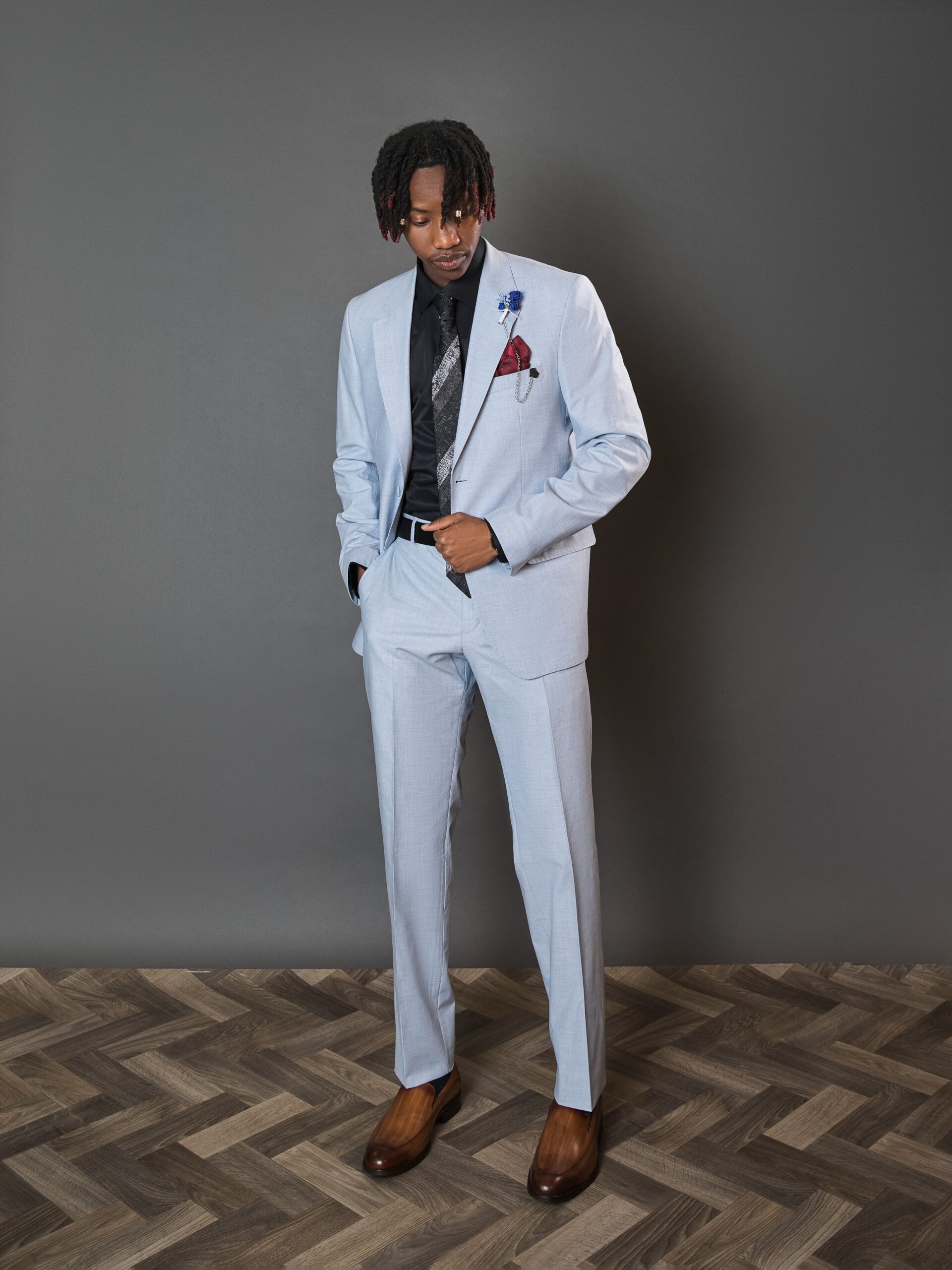 A sharp light blue suit tailored in a slim fit with a classic notch lapel is perfect for weddings, graduations, and special occasions.