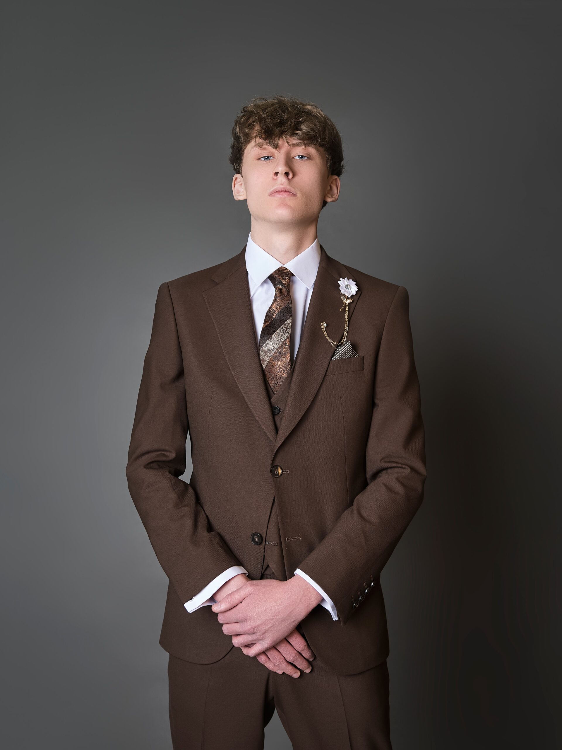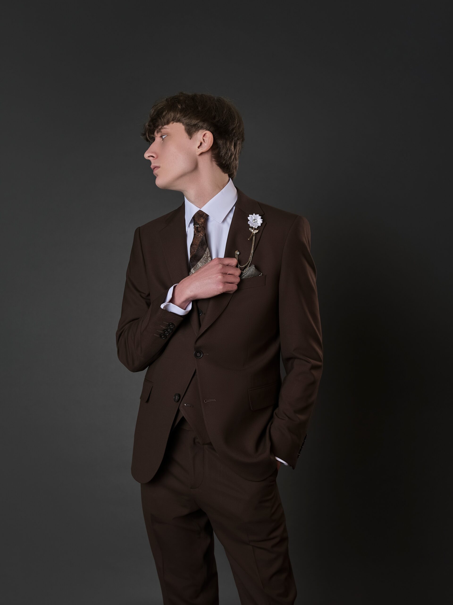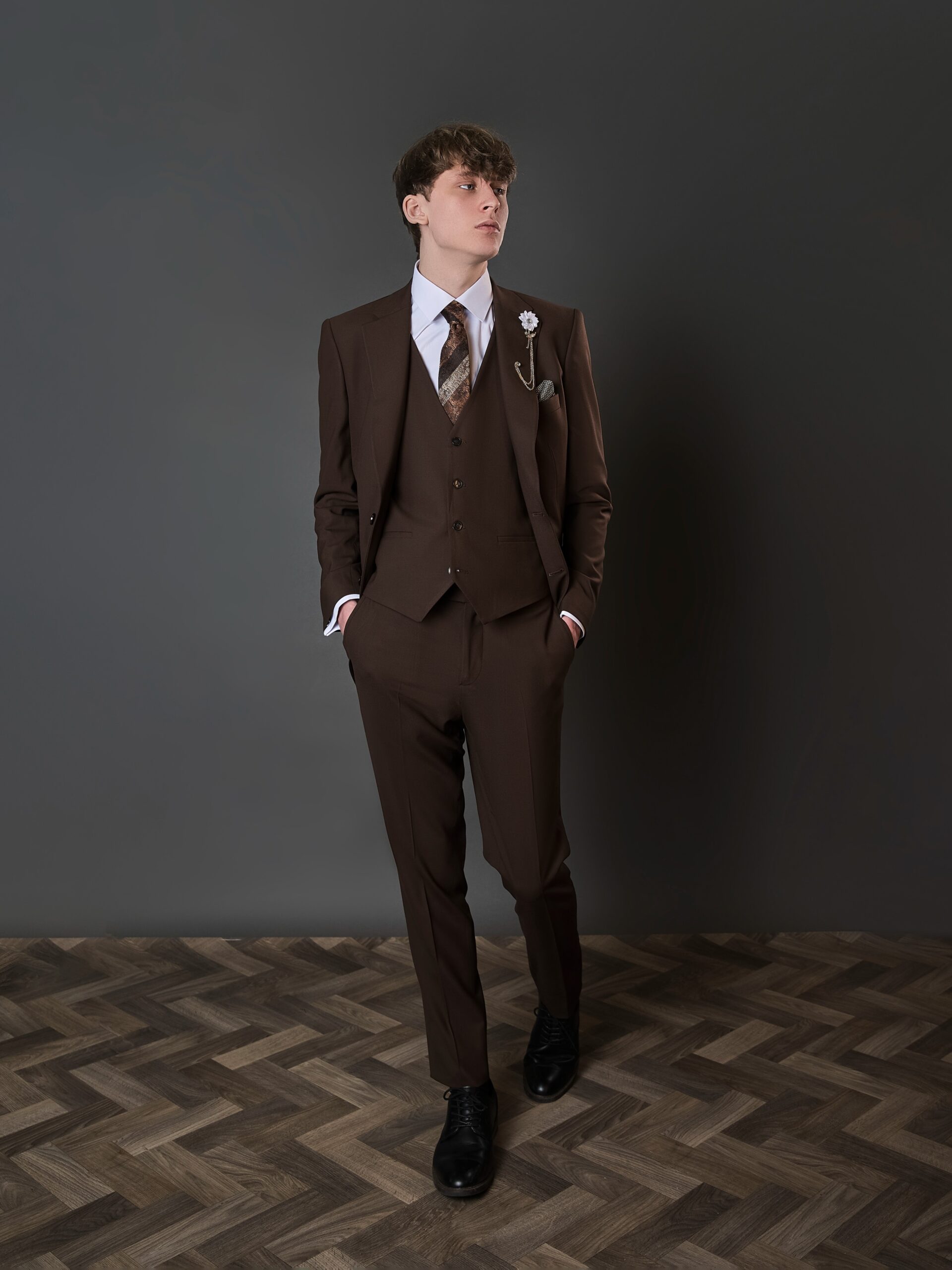 A sharp coffee-brown suit tailored in a slim fit with a classic notch lapel—perfect for weddings, graduations, and special occasions.