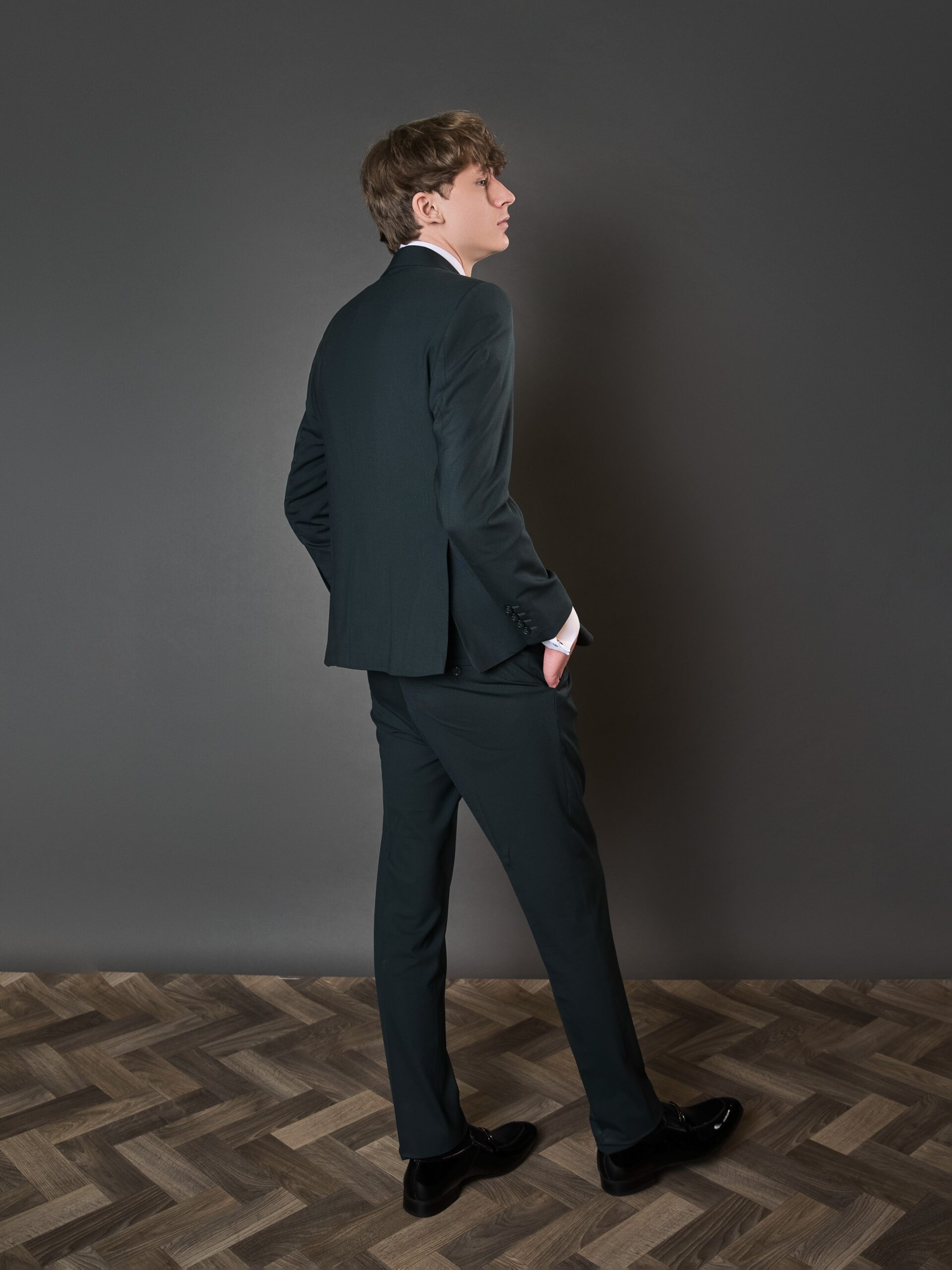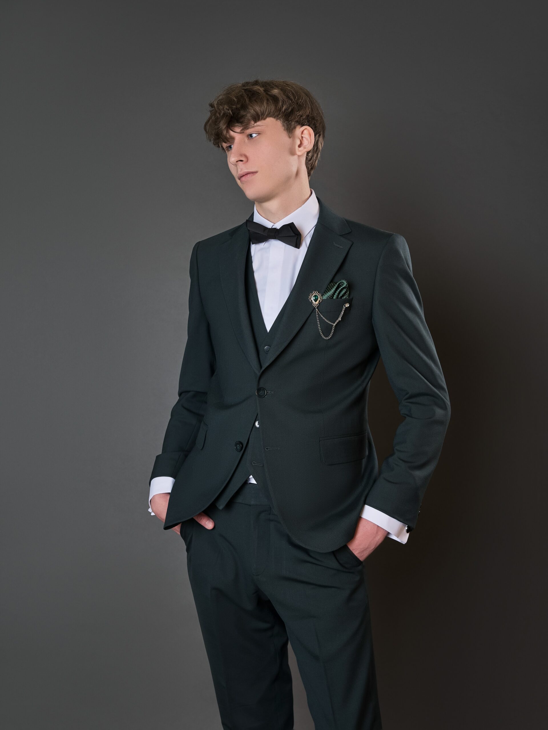 3-piece forest green suit in a slim fit with a classic notch lapel, perfect for weddings, graduations, and special occasions.