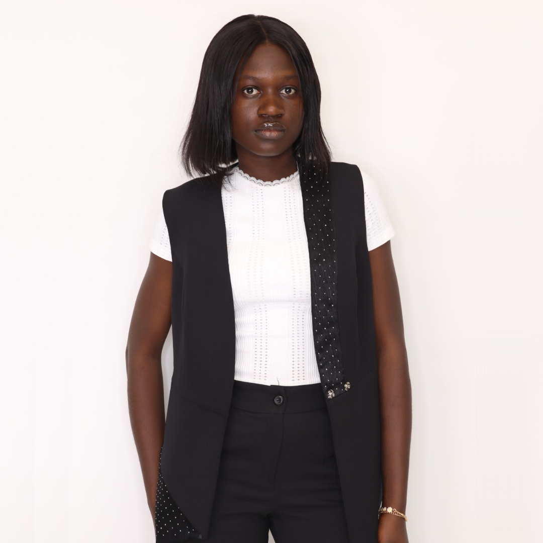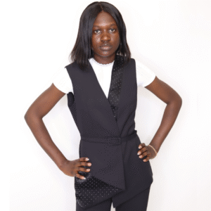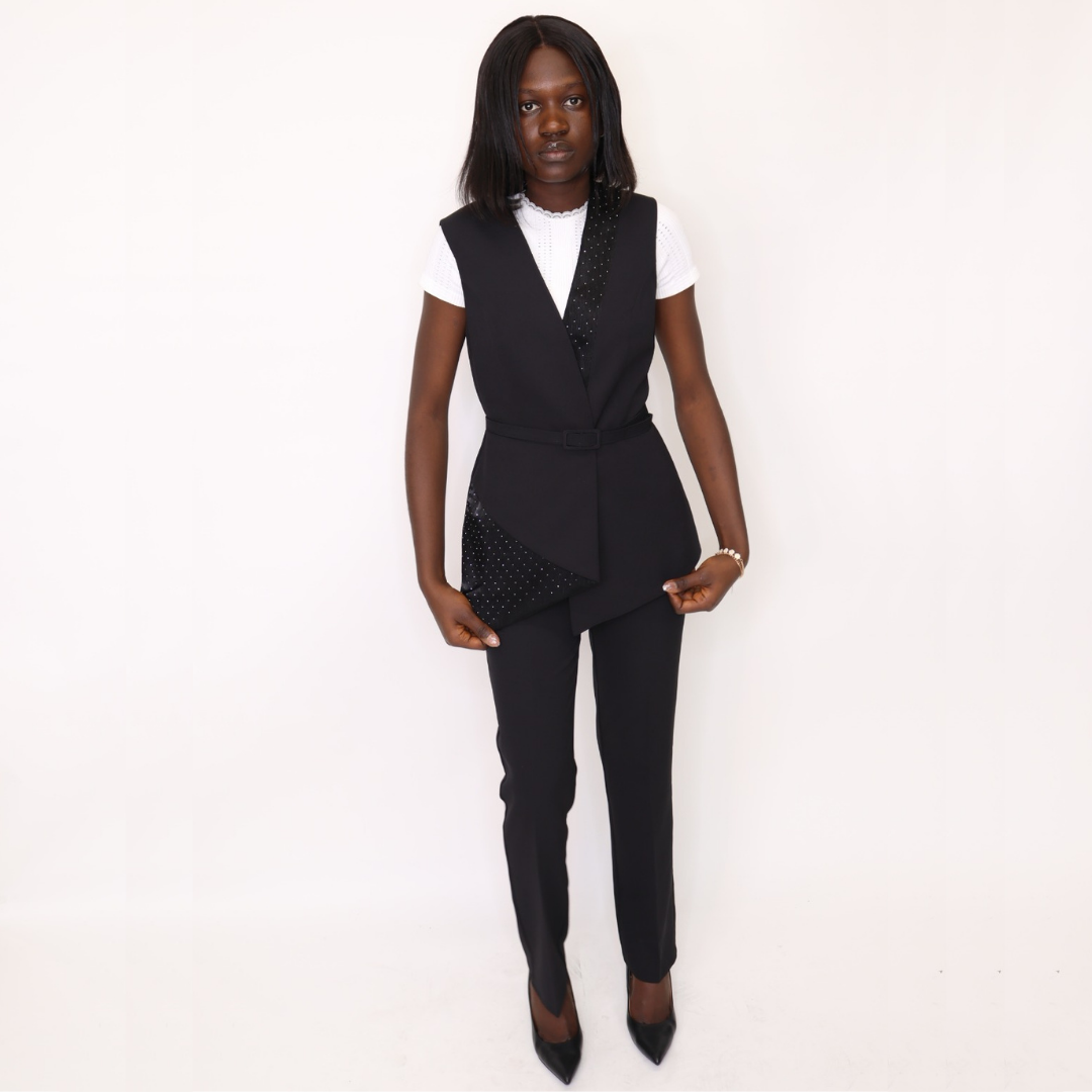 Chic, bold, and modern — this black sleeveless pantsuit is designed to redefine power dressing. Crafted from a 60% cotton and 30% polyester blend, it offers a structured yet comfortable fit. Featuring a wrap-style vest with subtle embellishment and tailored straight-leg trousers, it’s perfect for business events, evening outings, or stylish formal wear.
